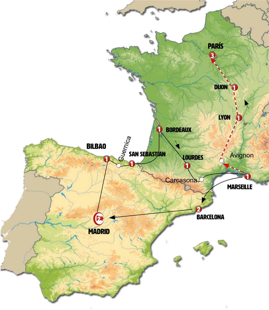 The entire center of Bordeaux has been recognized as a World Heritage Site. Prepare to be captivated by the "Water Mirror" and explore the historic old town with its charming pedestrian streets and 11th-century cathedral. Later, you´ll have free time to stroll along the Garonne River banks, lined with quaint restaurants perfect for lunch, or if you wish, you can visit Cité du Vin, an impressive interactive museum that delves into the history and production of wine. Afterward, we continue towards the Pyrenees, arriving in Lourdes by mid-afternoon. You´ll have time to visit the sanctuary (we suggest attending the candlelit procession). Dinner will be included.