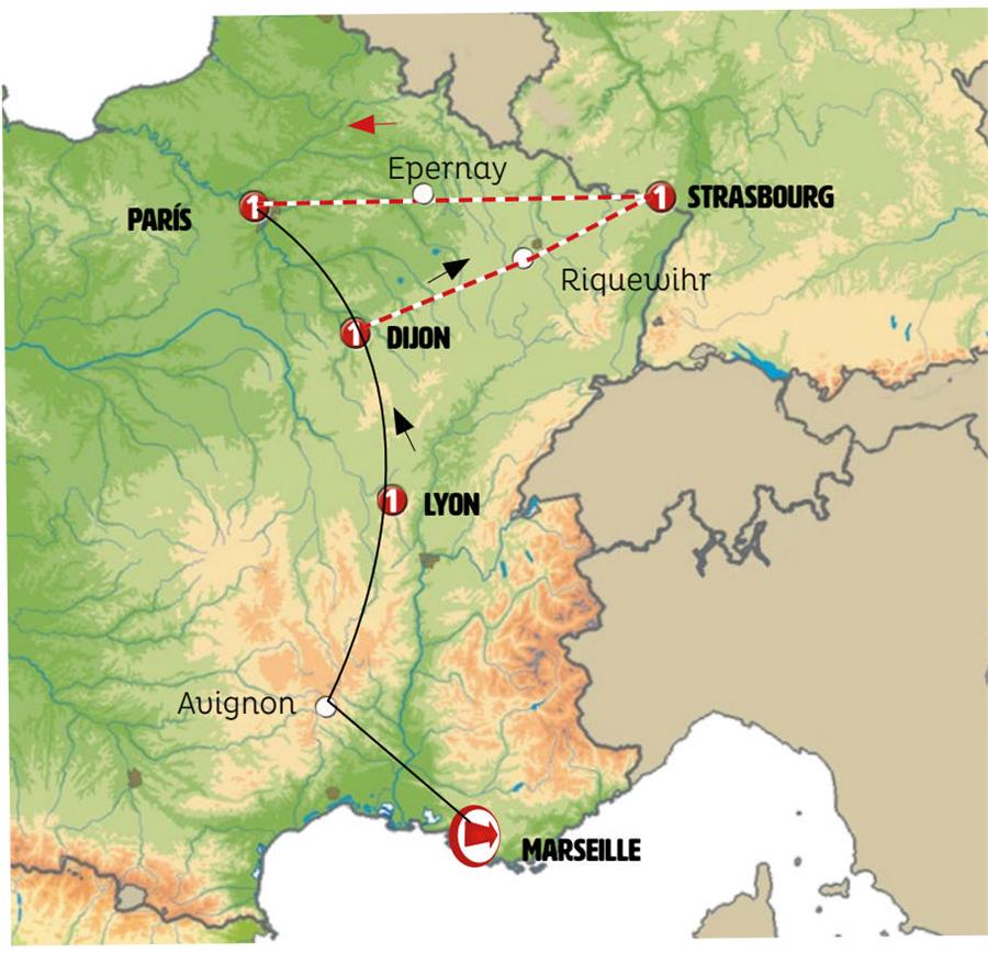 While still in the Burgundy region, we’ll stop in Besançon, a city of Roman origin with a beautiful historic center and a 17th-century citadel that overlooks the town. We’ll then continue our journey to Alsace, a French region that has been contested between France and Germany for centuries. Alsace retains its own German dialect, Alsatian, along with architecture and traditions deeply rooted in Germanic culture. Our first stop in Alsace will be Colmar, a city with unique architecture, colorful half-timbered houses and canals winding through the town. Colmar is also famous for its white wine and gastronomy. You’ll have time for lunch and a leisurely walk. In the afternoon, we’ll visit one of the most beautiful towns in Alsace: Riquewihr, a medieval town with cobblestone streets and colorful houses that look like they’re straight out of a fairy tale—it even inspired scenes from Beauty and the Beast. We will also take the opportunity to visit an old winery and have a tasting of local wine with a typical sweet. We’ll arrive in Strasbourg in the evening. We recommend taking a walk around the cathedral area and Petite France, both filled with charming spots and cozy restaurants.