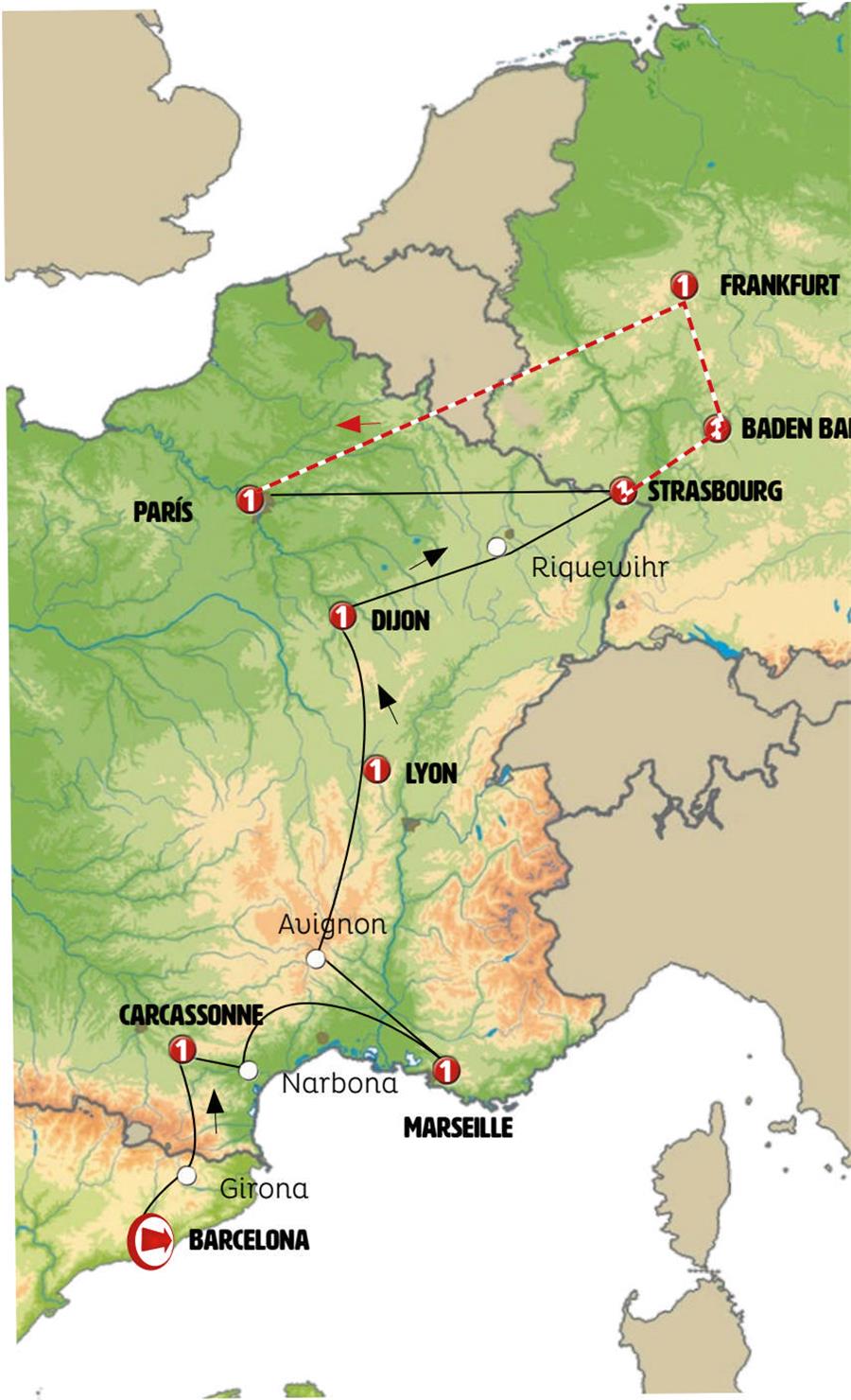We’ll travel through the south of France, stopping in Carcassonne, a city surrounded by some of the most beautiful walls in Europe. You´ll have time to walk and explore. After lunch, we’ll continue to Narbonne, where you’ll have free time to discover this historic Occitan city with its picturesque old town. In the late afternoon, we’ll arrive in Marseille, France’s second-largest city. We recommend a walk through its vibrant Vieux-Port (Old Port), bustling with life and dotted with charming small restaurants.