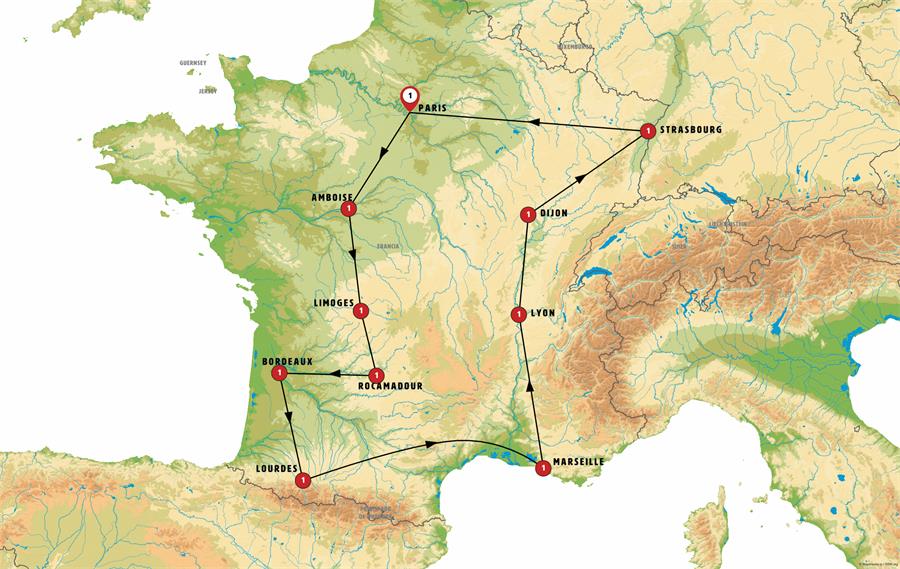 We´ll visit the impressive Padirac Chasm, where we´ll enjoy a boat ride on the river 75 meters underground. Afterwards, we´ll proceed to Collonges-la-Rouge, a picturesque village built with red stone on the Way of St. James. Following lunch, we´ll journey to Saint-Emilion, located in the heart of the Bordeaux wine-producing region, with time for a leisurely stroll. We’ll arrive in Bordeaux in the evening.