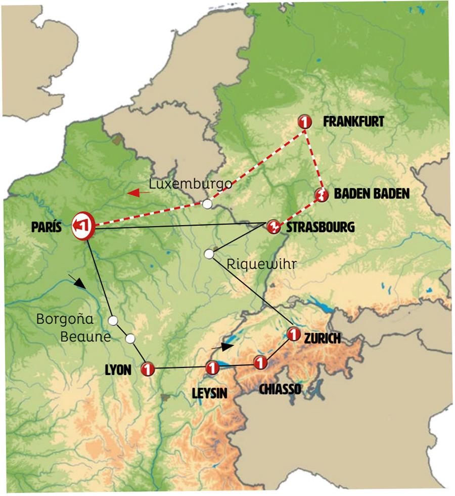 We’ll start our day in Strasbourg, the capital of Alsace and home to the European Parliament. The city’s historic center is a true gem, with its charming medieval streets, a stunning Gothic cathedral, and picturesque canals lined with flowers. We’ll include a boat trip through the canals of Petite France to fully appreciate this beautiful area. Afterward, we’ll cross into Germany, passing through the scenic mountain landscapes and towns of the Black Forest. In Freiburg, you’ll have time for lunch and a walk through this lively university city, known for its medieval center and impressive cathedral. We’ll then continue through the Black Forest to Triberg, one of the most picturesque towns in the region, famous for its cuckoo clocks. We’ll include admission to the Triberg Waterfalls, Germany’s highest waterfalls, which we´ll reach via a lovely walking path. Next, we’ll make a quick stop so you can take some pictures of Gengenbach, a charming town with a beautiful central square, before heading to Baden-Baden for the night. This spa town, once a favorite retreat for European nobility and the upper bourgeoisie, still exudes an air of elegance with its casinos, architecture, and parks.