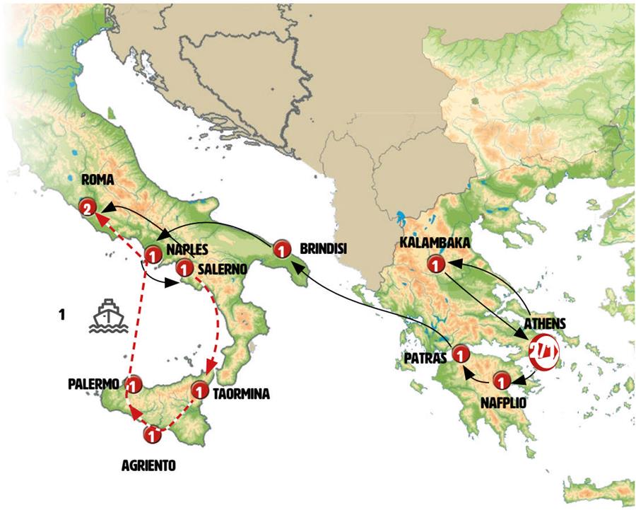 After breakfast, we’ll cross the Rio–Antirrio Bridge, a spectacular suspension bridge that connects the Peloponnese with the Greek mainland. We’ll travel through the regions of Central Greece and Epirus. Upon arrival in Igoumenitsa, a port town, there will be time for a stroll before boarding the modern ferry at 02:00 p.m. to sail across the Ionian Sea to Italy. We’ll reach Brindisi by the end of the day, around 09:00 p.m., where we’ll spend the night.