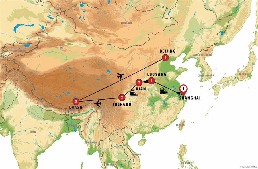 We leave Xian in a very modern high-speed train, and in just over three hours we cover the 700 km that separate us from CHENGDU. On arrival we will go to the Panda Bear research and breeding centre, a reserve where 120 giant pandas and 76 red pandas live. Lunch included. In the afternoon we will take a stroll through the People´s Park, with its small lake, the local people doing Taichi, and its tea houses.-