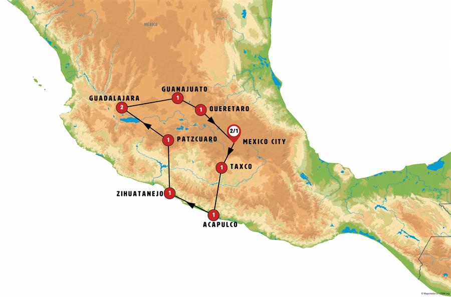 We’ll then continue to GUADALAJARA, the capital of the state of Jalisco, a vibrant colonial city known as the birthplace of Mariachi and Tequila. Arrival will be in the late afternoon.