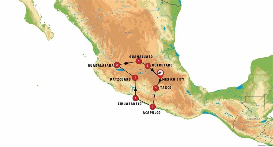 We’ll then continue to GUADALAJARA, the capital of the state of Jalisco, a vibrant colonial city known as the birthplace of Mariachi and Tequila. Arrival will be in the late afternoon.