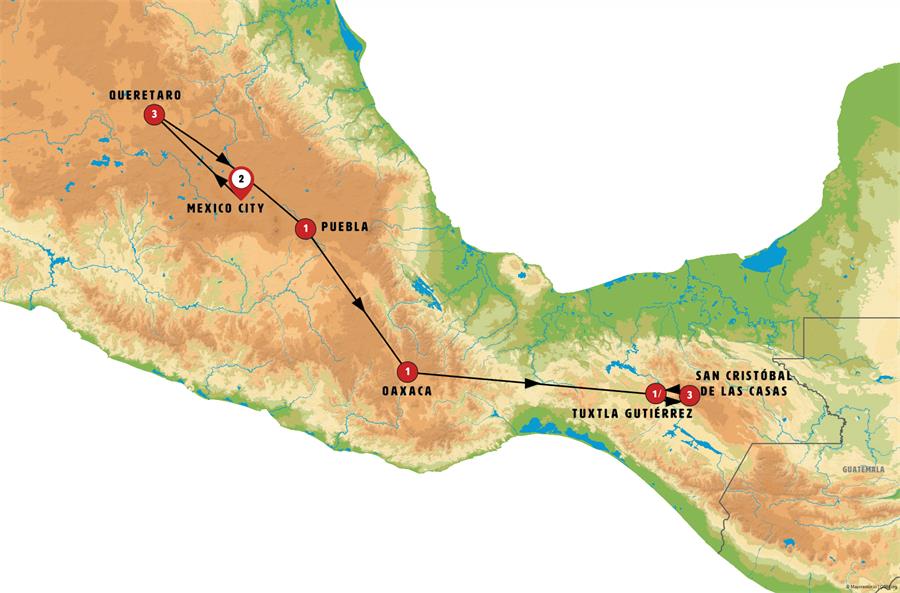 We see the CAÑON DEL SUMIDERO, on a boat we sail up this impressive canyon almost 1 km deep and 14 km long. Then we take a stroll in CHIAPA DEL CORZO, a colonial site of tradition and culture. After this, we go further into the Mayan culture and visit beautiful villages inhabited by the Tzotziles Indians. In ZINACANTAN we can admire the dresses of the women and the beautiful shops and weaving workshops. In SAN JUAN CHAMULA we will be surprised by its church which mixes Christianity with pre-columbine traditions in its rites. Continuation to SAN CRISTOBAL DE LAS CASAS. Afternoon free in this very beautiful colonial city founded in 1528.