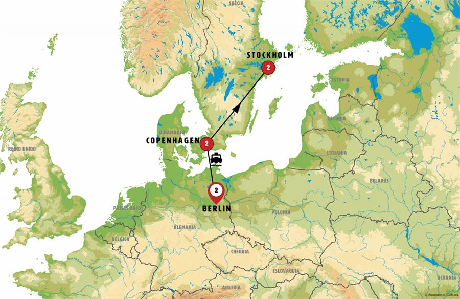 Enjoy some free time in BERLIN. At 11:30 a.m., we’ll depart from the German capital and head north. In Rostock, we’ll board a ferry, scheduled to depart at 03:30 p.m. The Baltic Sea crossing to DENMARK will take nearly two hours. Relish the cruise on this modern ship. Upon arrival in Denmark, we’ll travel through scenic landscapes, reaching COPENHAGEN by the end of the day.